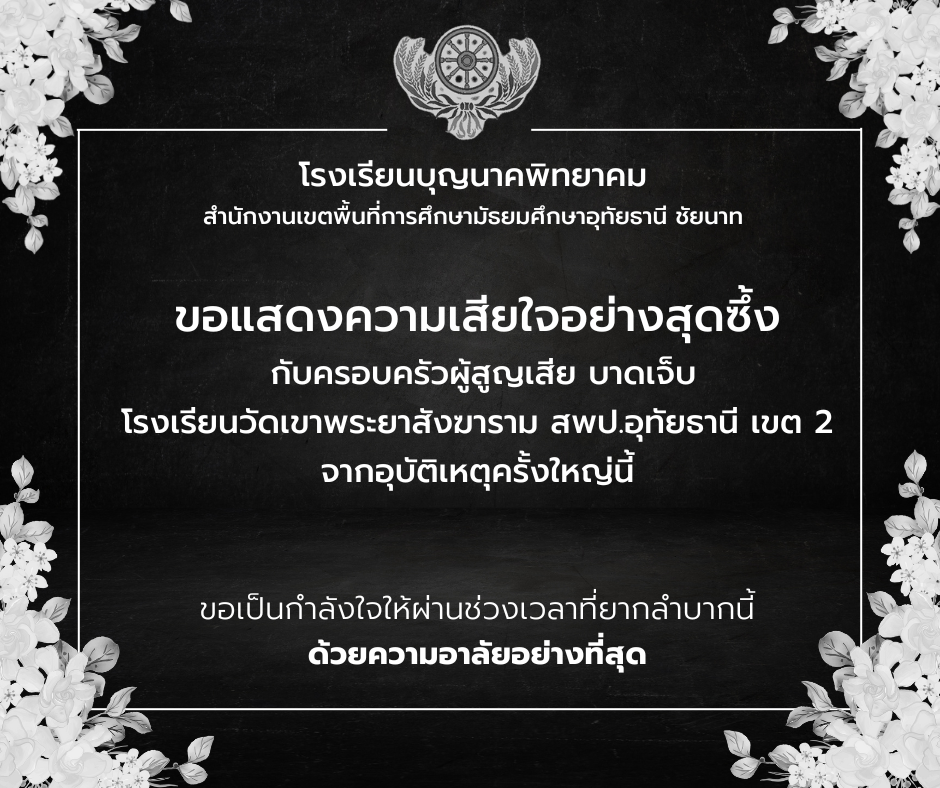 โรงเรียนบุญนาคพิทยาคม ขอแสดงความเสียใจกับครอบครัวผู้เสียชีวิต และบาดเจ็บ ในเหตุการณ์ไฟไหม้รถบัสทัศนศึกษา โรงเรียนวัดเขาพระยาสังฆาราม จังหวัดอุทัยธานี และขอส่งกำลังใจให้ครอบครัวผู้ประสบเหตุในครั้งนี้ด้วย
